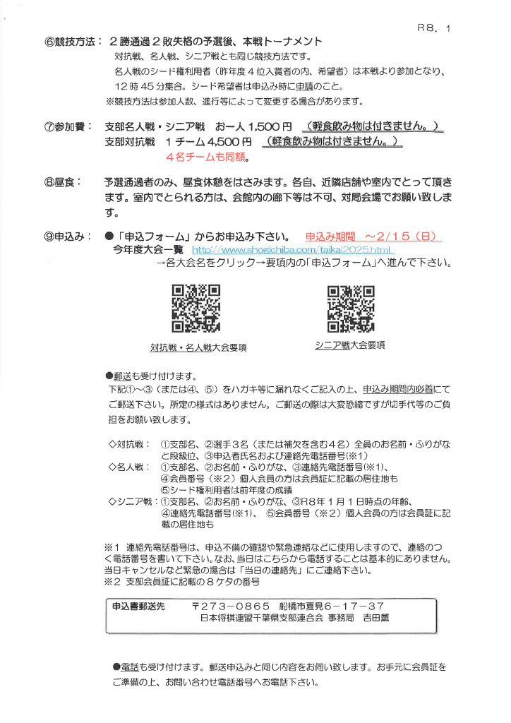 - 支部名人戦・シニア名人戦:お一人 1,500円