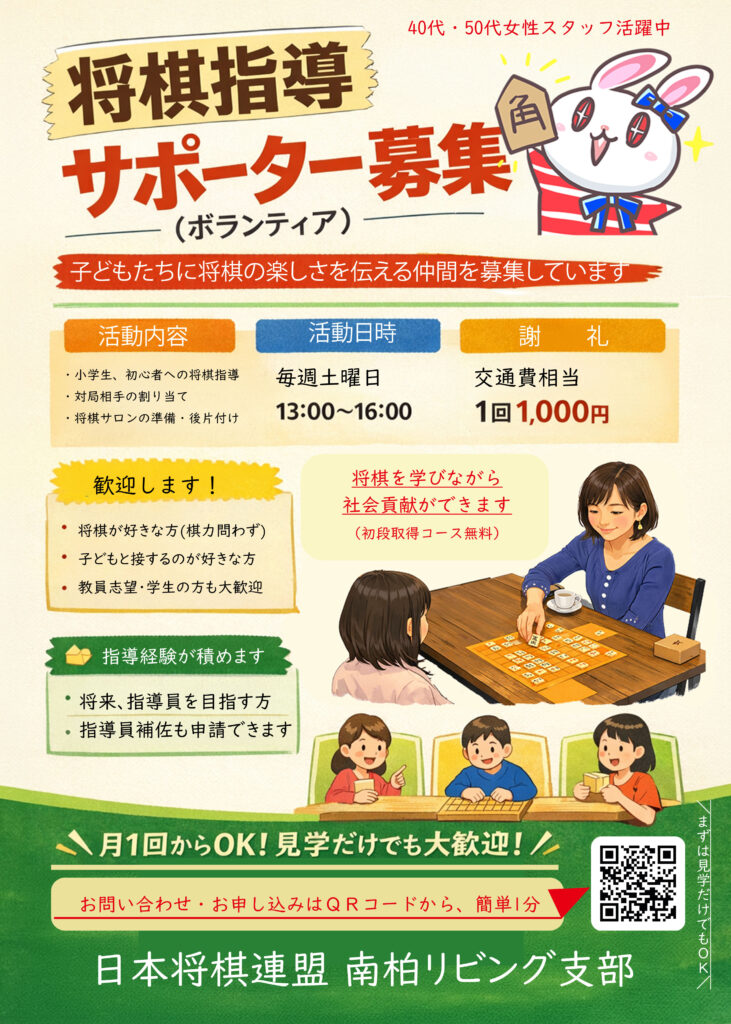 日本将棋連盟 南柏リビング支部では、子どもたちに将棋の楽しさを伝える「将棋指導サポーター」を募集しています。
